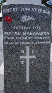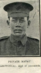 Enlisted 30 September 1915 and disembarked at Suez from SS Navua 15 March 1916. Embarked for France from Port Said 9 April 1916. Admitted to 2nd Australian General Hospital, Wimereux 18 August 1916 with pneumonia and on 21 August 1916 was put on the dangerously ill list. Died in France 29 August 1916. Buried at Wimereux Communal Cemetery and his headstone records his surname as Matau. Private MATAU 16/1189 also has a memorial military headstone at the Arorangi CICC churchyard in Rarotonga.